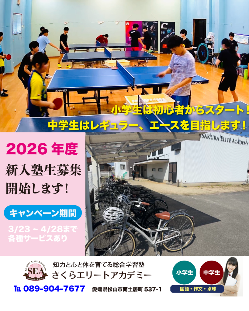 さくらエリートアカデミーは、愛媛県松山市の学習塾です🍊小学1年生〜中学3年生まで対象で、国語・作文と体育(卓球)クラスで、生徒たちが笑顔で元気に通える学習塾をコンセプトに指導しています。